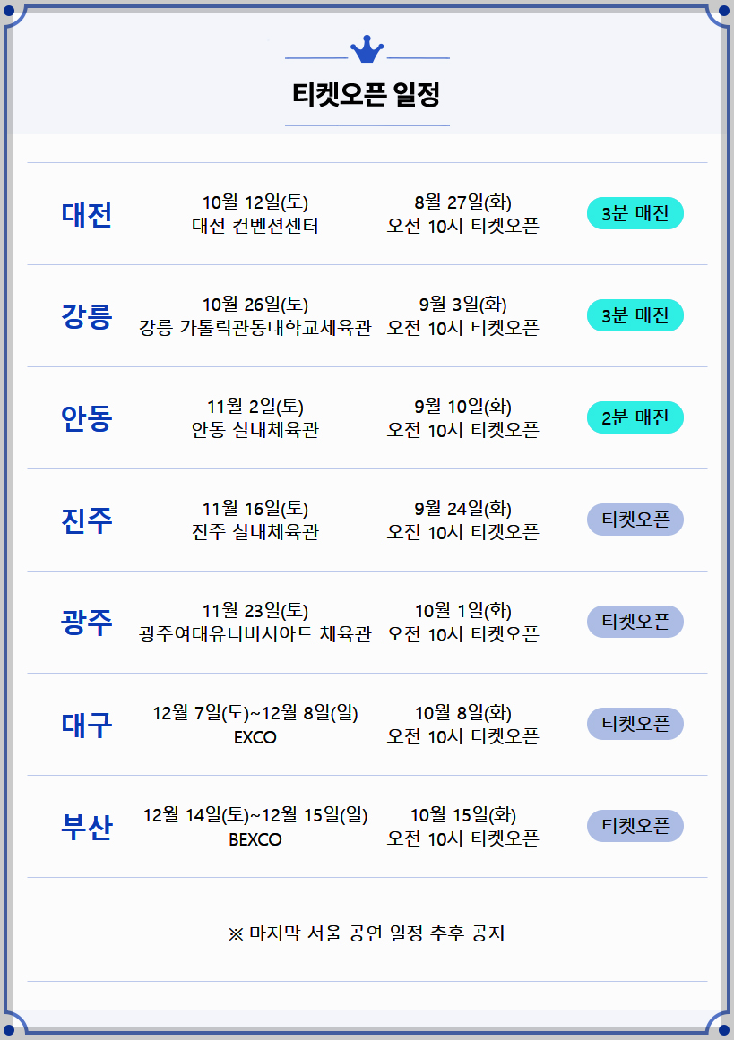 티켓 오픈 일정을 미리 확인하시고 티켓오픈 알림을 설정해 주세요.