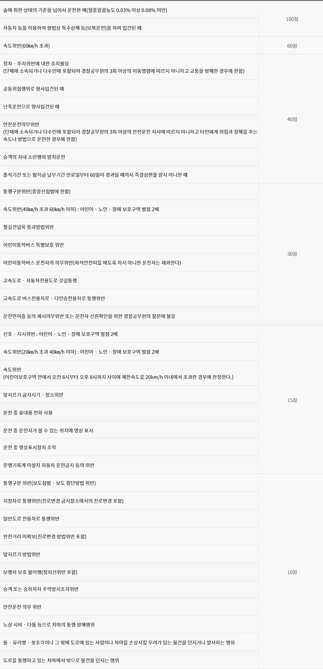 교통법규 위반시 벌점항목