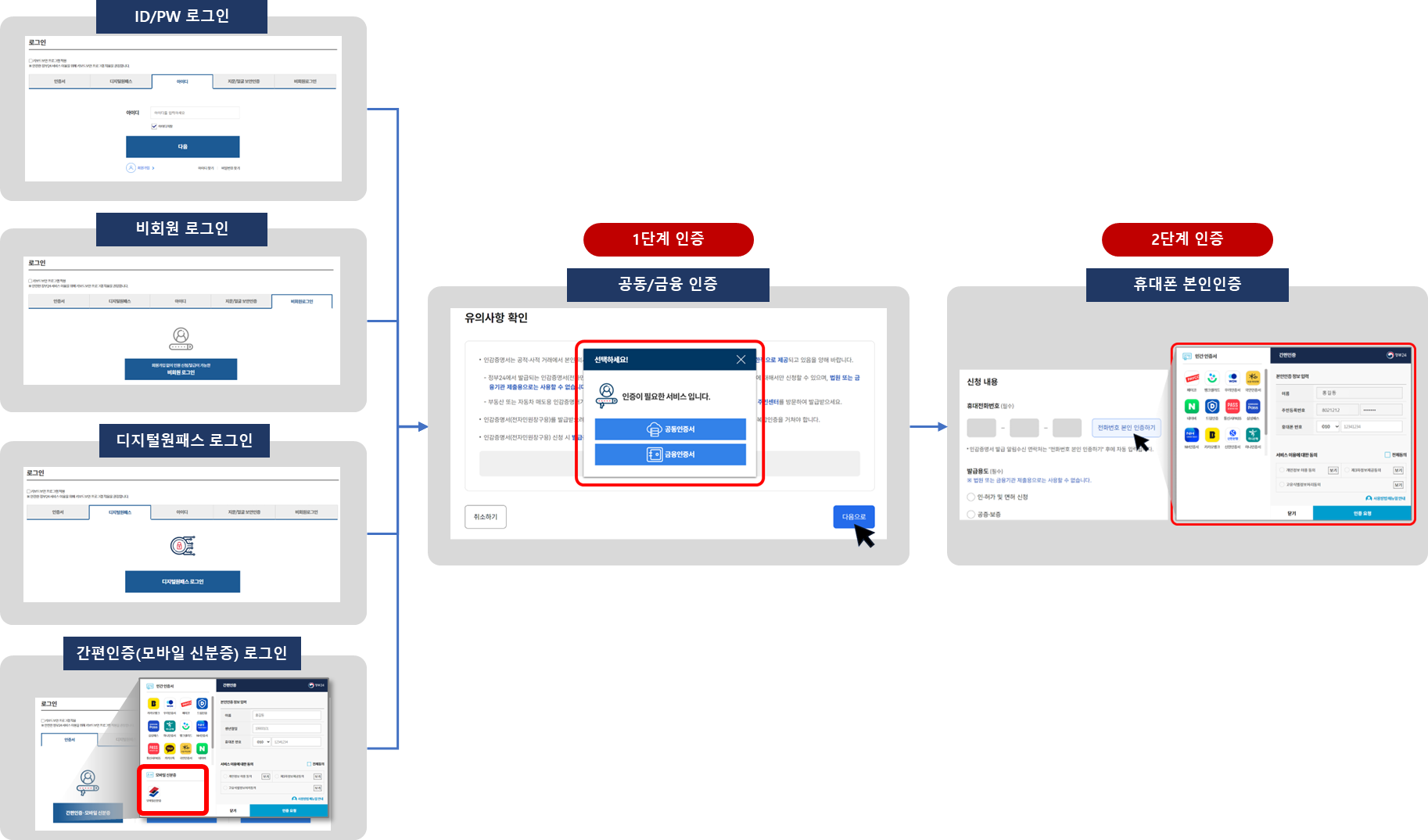 ID/PW, 비회원, 디지털원패스, 간편 인증(모바일신분증)