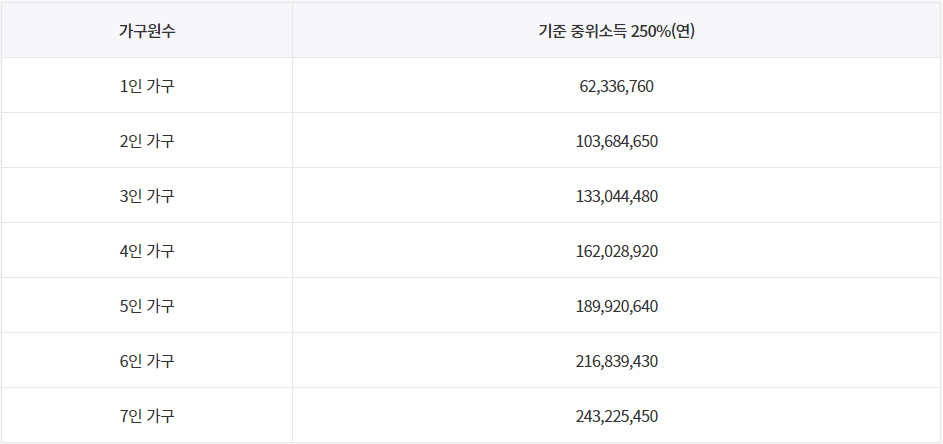 가구원 수에 따른 기준 중위소득 250% 이하에 해당하는 자